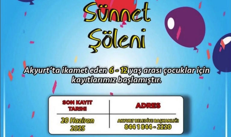 Belediyenin yaptığı açıklamada, “Akyurt’ta ikamet eden ve 6-12 yaş arasındaki çocuklar için sünnet kayıtları alınmaktadır. Aileler, başvuru için Kültür ve Sosyal İşler Müdürlüğümüze gelerek veya 844 1 844 / 2220 numaralı telefondan detaylı bilgilere ulaşabilirler.” denildi.